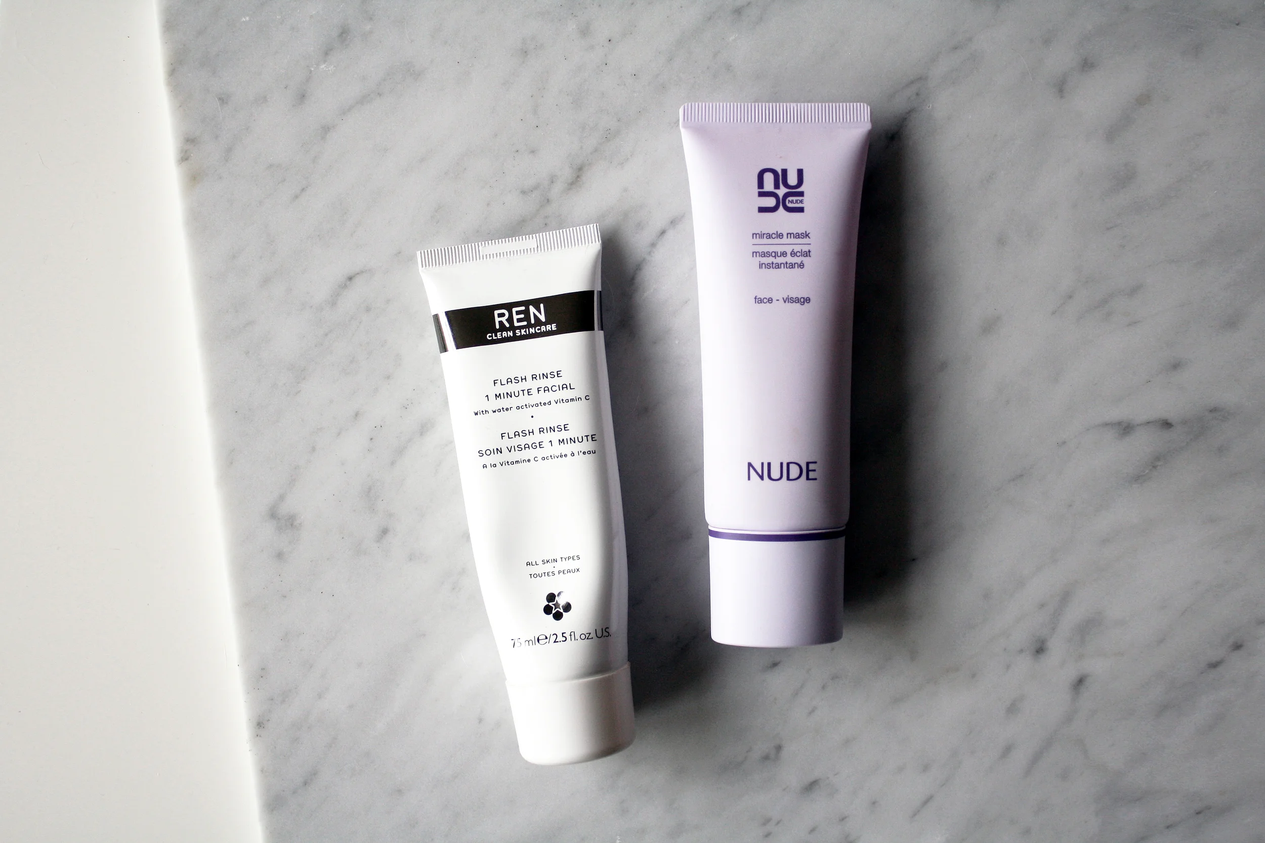 I usually apply masks at night to really deep clean and help target any problems I feel my skin is feeling that week, but occasionally when I wake up, my skin can be in dire need of some love as well. The two masks that I reach for are the Ren Flash Rinse 1 Minute Facial and the Nude Skincare Miracle Mask.